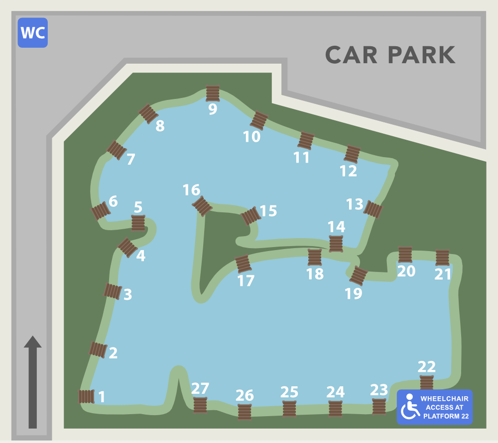 There are 27 platforms (pegs) to fish from, all of which can be accessed easily from the path around the lake. There is a substantial car park at the north side that we ask you to park in. An island and walkway splits the lake on one side. The walkway can be fished from the pegs.